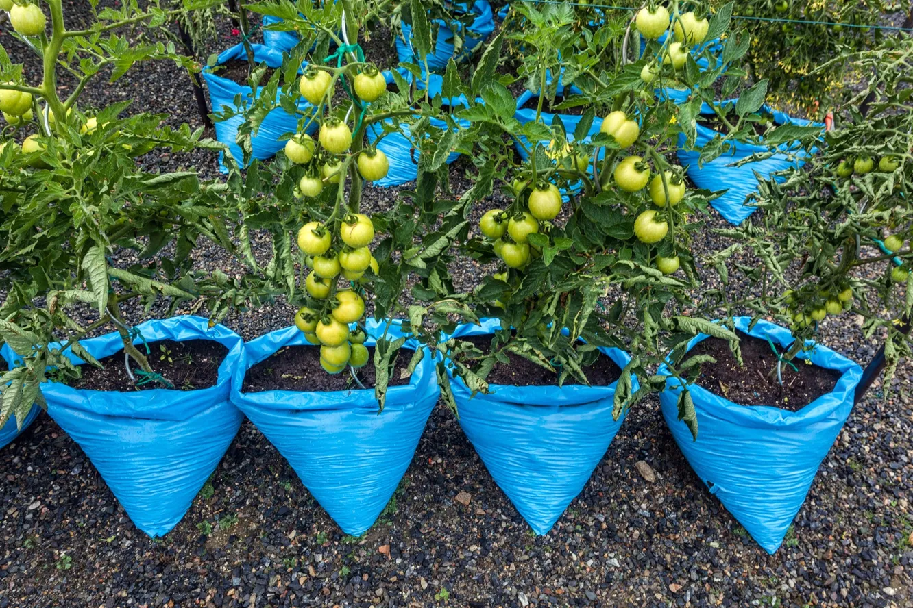 Pentru a cultiva roșii, puteți folosi orice pungi rezistente de polietilenă, precum cele folosite pentru pământul de răsad. Totuși, se pot rupe dacă sunt mutate prin grădină.